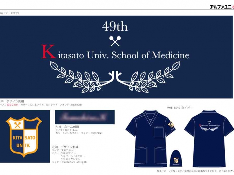 卒業記念 【NO.296】北里大学医学部49期様 WH11485 デザイン刺繍ネーム刺繍背中袖 【実績No.296】 北里大学医学部49期様-卒業記念スクラブのご紹介です。背中に月桂樹を豪華に入れたデザインを、左袖には大学の徽章を刺繍で入れました。 このたびは製作のご依頼、および画像のご提供ありがとうございました。 お客様からのコメント デザインもお願いしたものと出来上がりがほぼ同じだったこと、デザイン製作から到着までもスムーズに対応していただけて助かりました。 無事学年で撮影出来て良かったです。 ありがとうございました。 からのコメント このたびはアルファユニをご利用いただきましてありがとうございました! ●マーキングの詳細説明 背中に北里大学マークと月桂樹を組み合わせたデザイン刺繍、左袖に同大学の徽章のデザイン刺繍とネーム刺繍を入れさせていただきました。 この記事をシェア その他おすすめ事例 【No.2】福島県立医科大学様 Z1004 【No.4】大学医学部医学科LaRa 8th卒業生様 DS-2001 【No.5】東京医科大学2015年卒業生様 7000SC 実績一覧 特集 アルファユニカタログVol.5 刺繍の見た目が変わる?生地の違いと刺繍の差 コックコート・飲食系ユニフォーム特集 全面昇華プリントスクラブ 特集一覧
