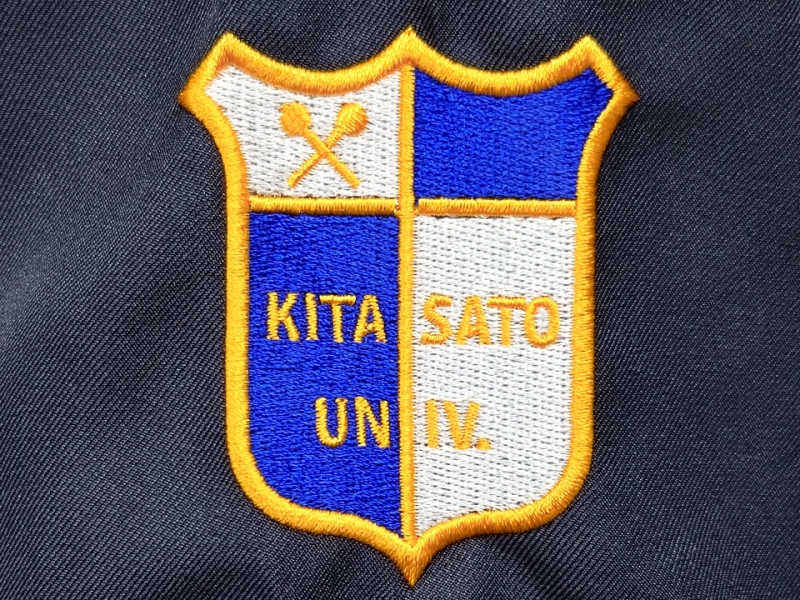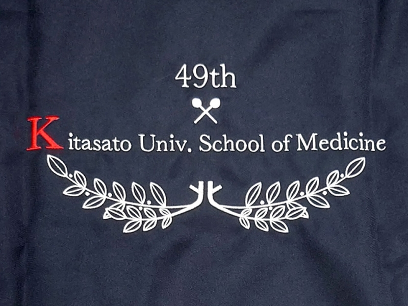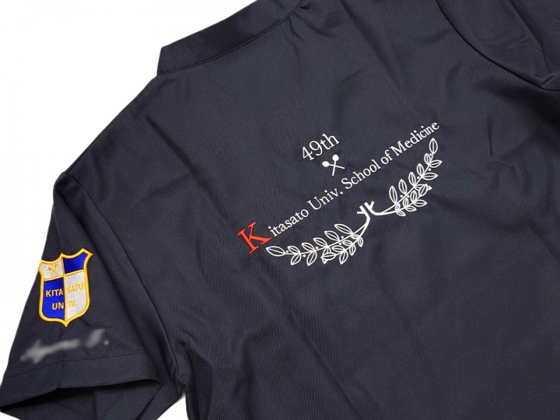 背中に北里大学マークと月桂樹を組み合わせたデザイン刺繍、左袖に同大学の徽章のデザイン刺繍とネーム刺繍を入れさせていただきました。