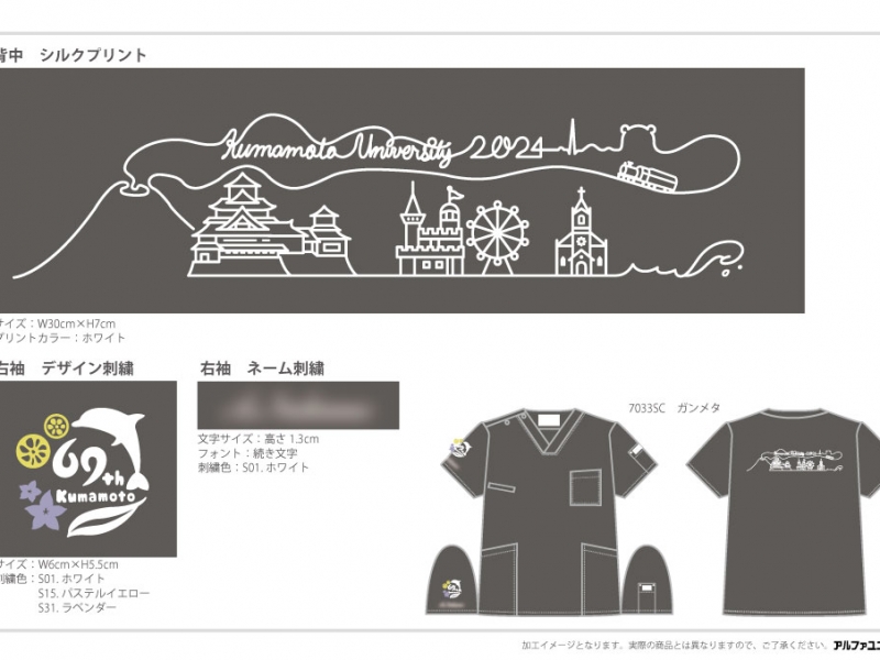 卒業記念 【NO.309】熊本大学医学部69th様 7033SC シルクプリントデザイン刺繍ネーム刺繍背中袖 【実績No.309】 熊本大学医学部69th様-卒業記念スクラブのご紹介です。 卒業記念製作について先輩から引継ぎをしていただいているようで、ほぼ毎年ご注文をいただいております。 いつもありがとうございます。合わせて着用画像のご提供もありがとうございました。 お客様からのコメント 今回は卒業記念のスクラブをご製作いただきありがとうございます。 デザインや色を細かくお願いしてしまいましたが、どのカラーのスクラブも綺麗に仕上げていただき同期からも好評です。 変更などにも丁寧にご対応いただきありがとうございました。 からのコメント このたびはアルファユニをご利用いただきましてありがとうございました! ●マーキングの詳細説明 右袖にイルカと蓮根、りんどうの花を組み合わせたデザイン刺繍とネーム刺繍。 背中に熊本城やグリーンランドといった熊本ならではのスポットをイメージしたデザインのシルクプリントを入れさせていただきました。 この記事をシェア その他おすすめ事例 【No.2】福島県立医科大学様 Z1004 【No.4】大学医学部医学科LaRa 8th卒業生様 DS-2001 【No.5】東京医科大学2015年卒業生様 7000SC 実績一覧 特集 アルファユニカタログVol.5 刺繍の見た目が変わる?生地の違いと刺繍の差 コックコート・飲食系ユニフォーム特集 全面昇華プリントスクラブ 特集一覧
