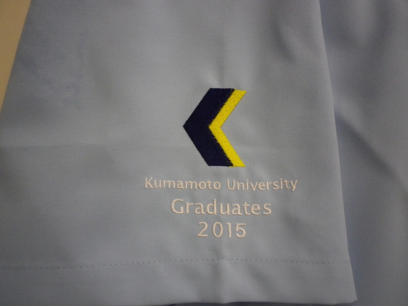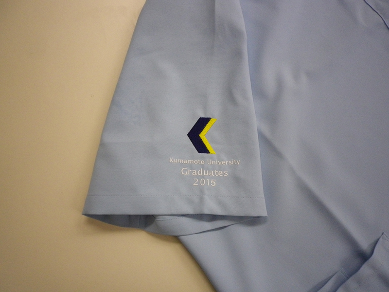 左袖に熊本大学の医学部のマークを、個人名をそれぞれ右袖に入れました。左袖のマークは刺繍型がありましたので、型修正費が若干かかりましたが、年数だけを修正して刺繍しました。