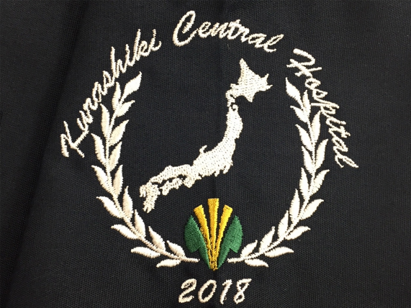 デザインの中心となっている日本列島のイラストは、各半島、島までかなり細かく再現できています。倉敷中央病院のマークと月桂樹で囲んだデザインとなっております。