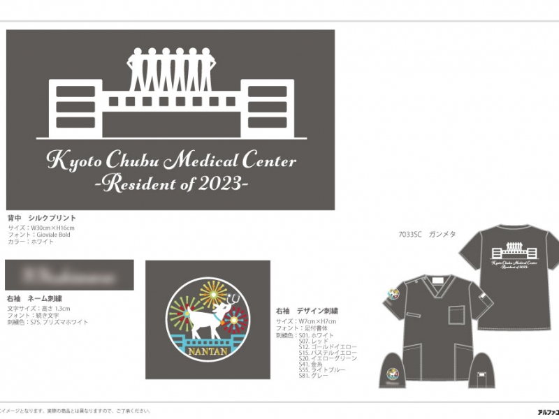 研修医 【NO.305】京都中部総合医療センター2023年研修医様 7033SC シルクプリントデザイン刺繍ネーム刺繍プリント 1色背中袖 【実績No.305】 京都中部総合医療センター2023年研修医様-オリジナルチームスクラブのご紹介です。 このたびは製作のご依頼、および画像のご提供ありがとうございました。 お客様からのコメント 初めて利用しましたが、改良を重ねるごとにどんどん可愛いデザインに仕上げていただき大満足です! わがままな要望にも応えてくださり、感謝の気持ちでいっぱいです。 おかげさまで念願だったお揃いのスクラブを作ることができました。 ありがとうございました。 からのコメント このたびはアルファユニをご利用いただきましてありがとうございました! デザインを作っていく過程で少しずつ仕上がりのイメージをお伝えすることができ、最終的に仕上げったスクラブについてもご満足をいただけたようで、製作側としては大変嬉しく思います。 八木町=ヤギ?と南丹市大堰川の花火の組み合わせが8色使いでカラフルで可愛いデザインとなりましたが、実は花火を表す線は先端に行くほど太くなり丸い点が付いています。 微妙な表現ですが、なんとか細かい部分まで刺繍でしっかり再現できてほっとしています。 ●マーキングの詳細説明 右袖に花火とヤギ、同センターの外観のイメージを組み合わせたデザイン刺繍とネーム刺繍、背中にも肩を組む人たちと同センターの外観をイメージしたシルクプリントを入れさせていただきました。 この記事をシェア その他おすすめ事例 【No.17】焼津市立病院様 7003SC 【No.24】長岡赤十字病院研修医様 MZ-0092 【No.50】宮古島徳洲会病院様 7003SC 実績一覧 特集 アルファユニカタログVol.5 刺繍の見た目が変わる?生地の違いと刺繍の差 コックコート・飲食系ユニフォーム特集 全面昇華プリントスクラブ 特集一覧