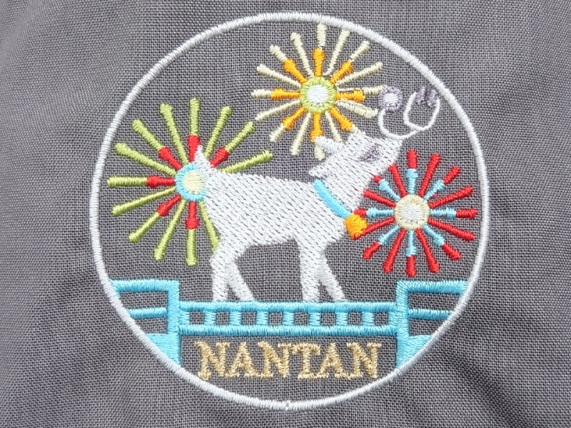 右袖に花火とヤギ、同センターの外観のイメージを組み合わせたデザイン刺繍とネーム刺繍、背中にも肩を組む人たちと同センターの外観をイメージしたシルクプリントを入れさせていただきました。