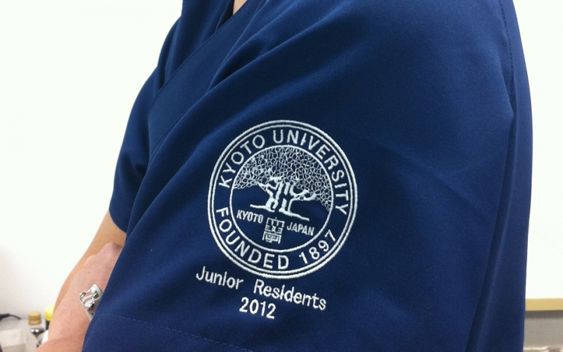 京都大学附属病院のエンブレム(右上の画像)を左袖に刺繍で入れ、その下に「Junir Residents 2012」とブロック体で入れました。ポイントは円内センターの木とその枝の細かい部分の再現です。 さらには、円内中央下側の校章もかなり細かく、刺繍でどこまで再現できるか、正直やってみないとわかりませんでしたが、実際にはかなりのレベルでほぼ元データ通りに表現ができ、出来上りの質についてお客様にはご満足いただけましたし、製作側としてもとても満足しております。