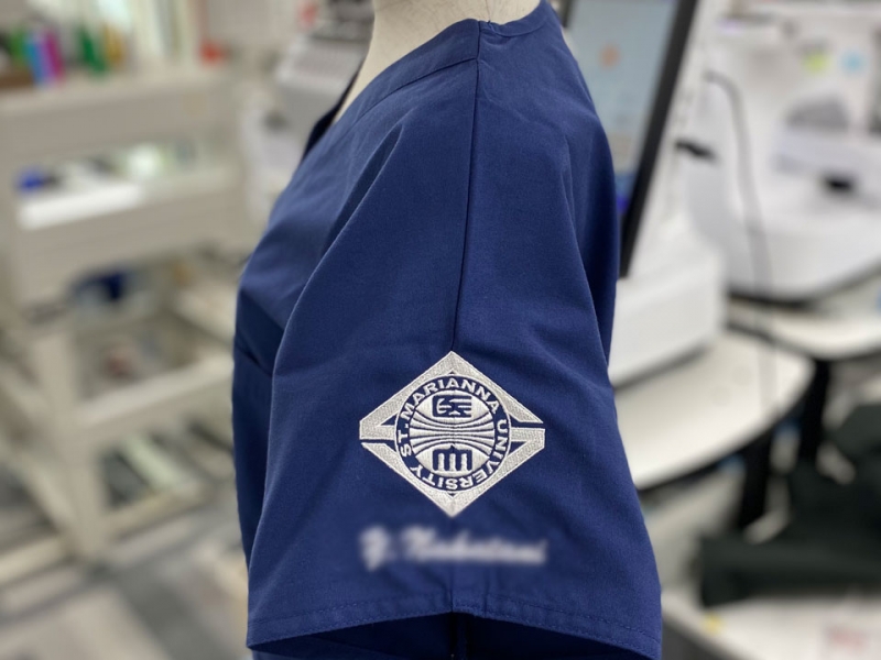 左袖にデザイン刺繍とネーム刺繍、右袖に病院名を有り文字刺繍で入れさせていただきました。
