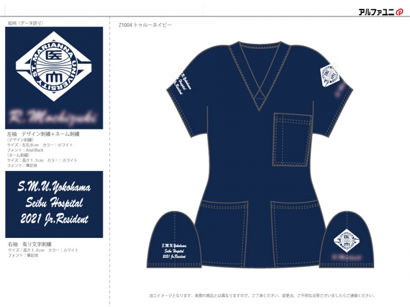 研修医 【NO.207】聖マリアンナ医科大学横浜市西部病院2021様 Z1004 デザイン刺繍ネーム刺繍フォント刺繍袖 【実績No.207】 聖マリアンナ医科大学横浜市西部病院2021様-デザインスクラブのご紹介です。 このたびは製作のご依頼、および画像のご提供ありがとうございました。 お客様からのコメント スクラブ作成の際には大変お世話になりました。 今後もスクラブを追加注文させていただくこともあることと思いますので、その際はよろしくお願いいたします。 からのコメント このたびはアルファユニをご利用いただきましてありがとうございました! ●マーキングの詳細説明 左袖にデザイン刺繍とネーム刺繍、右袖に病院名を有り文字刺繍で入れさせていただきました。 この記事をシェア その他おすすめ事例 【No.17】焼津市立病院様 7003SC 【No.24】長岡赤十字病院研修医様 MZ-0092 【No.50】宮古島徳洲会病院様 7003SC 実績一覧 特集 アルファユニカタログVol.5 刺繍の見た目が変わる?生地の違いと刺繍の差 コックコート・飲食系ユニフォーム特集 全面昇華プリントスクラブ 特集一覧