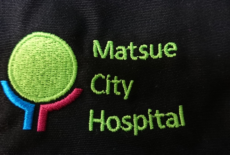 左袖には、病院マークのデザイン刺繍と、左ポケット口上にネーム刺繍を入れました。 刺繍カラーは、ネオングリーン、ワインレッド、ブルーの3色です。 刺繍サイズが天地3㎝と非常に小さかったのですが、シンプルなデザインということで、綺麗に再現できました。小さいデザインは、細かい部分は刺繍したときに潰れないかを細部までチェックし、必ず現場と確認します。円形が歪まないようにを刺繍することは、すべてのオブジェクトで一番難しいのですが、さほど大きくなかったので、問題ありませんでした。