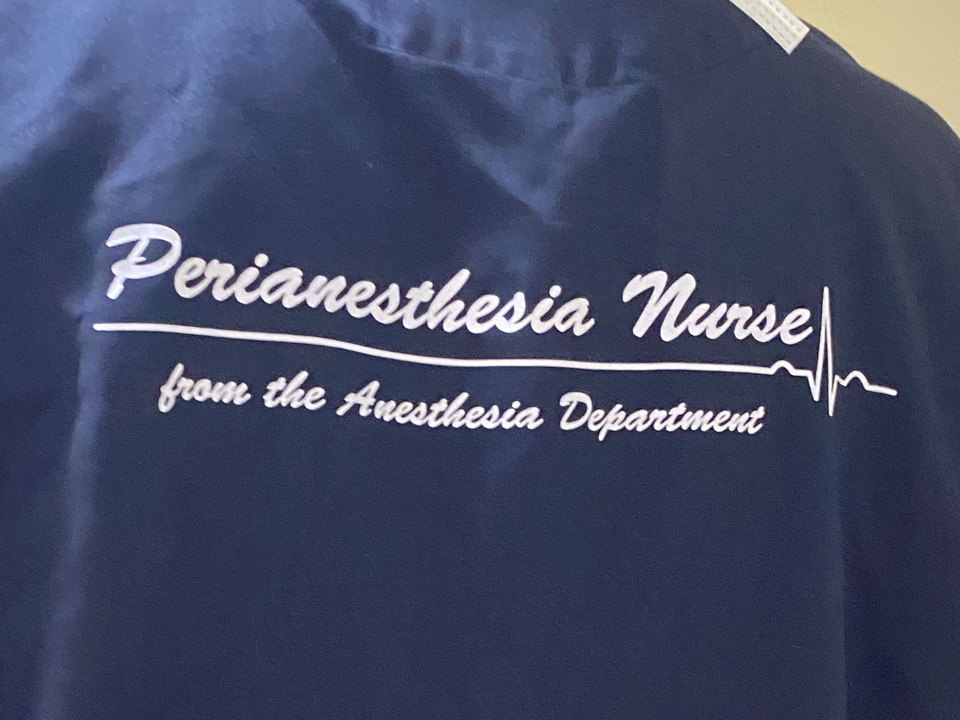背中に診療科名をシルクプリントで入れさせていただきました。10枚以上であれば、1色のシルクプリントがもっとも安価でかつ、それなりに洗濯耐久性のある加工方法ということでおススメです。プリントの場合、多少インクとの相性が多少はありますが、インクに定着を強化するボンドを加えておりますので、耐久性は高くなっていると言えます。