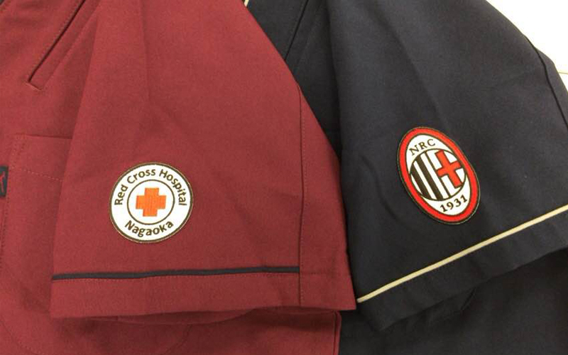 赤十字マークについては日本赤十字社が細かい規定を設定しているため、赤十字マークを規定通りにしたものでデザインを作成し提案させていただいたところ、お客様の希望と違うデザインとなってしまい大変ご面倒をおかけしました。申し訳ございませんでした。 病院の確認も取れているということで最終的にはお客様のご希望通りのデザインで刺繍ワッペンを作成し、左袖に取り付けました。ワッペンサイズは2パターンとも若干小さめでしたが、ワッペン独特の存在感があり、とてもかっこよく出来上がりました。
