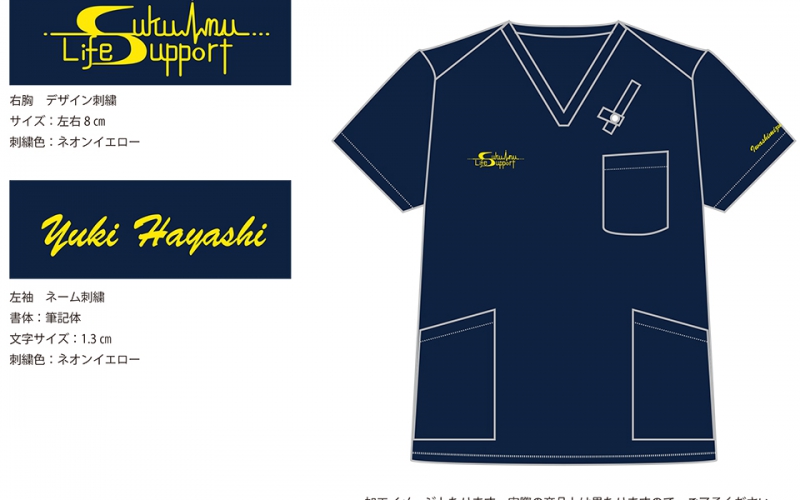 右胸にデザイン刺繍(ネオンイエロー)、左胸にネーム刺繍を入れました。スクラブカラーとマーキングカラーのパターンをいくつかこちらからご提案した結果、最終的に、スクラブはダークネイビー/ブラック、刺繍はネオンイエローにしましたので、ロゴがかなり目立ちます。