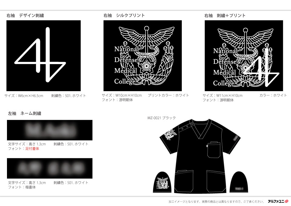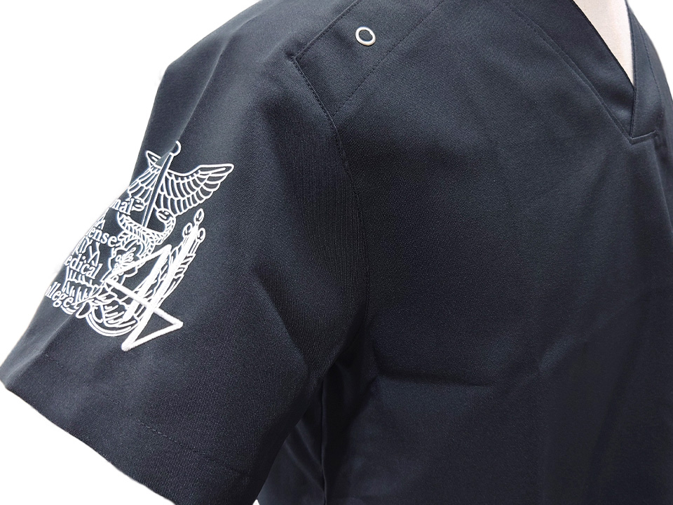 卒業記念 【NO.315】防衛医科大学校医学科第46期生様 MZ-0021 シルクプリントデザイン刺繍ネーム刺繍プリント 1色袖 【実績No.315】 防衛医科大学校医学科第46期生様-卒業記念スクラブのご紹介です。 袖の加工は校章デザインをシルクプリントし、その上に「46」を刺繍しました。 このたびは製作のご依頼、および画像のご提供ありがとうございました。 お客様からのコメント 見積もりから商品の発送まで密に連絡を取ってくださり、結果として大変満足のいくスクラブを作成することが出来ました。本当にありがとうございました。 校章のプリントの上に刺繍していただきましたが、原案とのズレが少なく素晴らしい出来でした。 また機会がありましたらぜひ宜しくお願い致します。 からのコメント このたびはアルファユニをご利用いただきましてありがとうございました! ●マーキングの詳細説明 右袖に校章をシルクプリントで加工し、それと重ねて「46」の文字をデザイン刺繍で入れました。左袖にはネーム刺繍を入れています。 この記事をシェア その他おすすめ事例 【No.2】福島県立医科大学様 Z1004 【No.4】大学医学部医学科LaRa 8th卒業生様 DS-2001 【No.5】東京医科大学2015年卒業生様 7000SC 実績一覧 特集 アルファユニカタログVol.5 刺繍の見た目が変わる?生地の違いと刺繍の差 コックコート・飲食系ユニフォーム特集 全面昇華プリントスクラブ 特集一覧