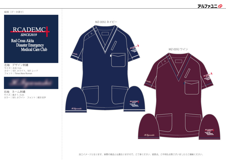 チームスクラブ 【NO.271】日本赤十字秋田看護大学RCADEMC様 MZ-0092 デザイン刺繍ネーム刺繍袖 【実績No.271】 日本赤十字秋田看護大学RCADEMC様-チームスクラブのご紹介です。 このたびは製作のご依頼、および画像のご提供ありがとうございました。 また、オリジナルスクラブ製作の機会がございましたら、お問い合わせお待ちしております。 お客様からのコメント 今回初めて、スクラブ刺繍を入れて作成させていただきました。 デザインの段階で急な変更にも関わらず丁寧な対応していただき、素敵なスクラブをありがとうございます。 今後も機会があれば利用したいと思っております。 からのコメント このたびはアルファユニをご利用いただきましてありがとうございました! ●マーキングの詳細説明 左袖にデザイン刺繍、右袖にネーム刺繍を入れさせていただきました。 この記事をシェア その他おすすめ事例 【No.3】嘉悦大学インキュベーション同好会様 1525PH(廃番) 【No.6】北野病院様 MZ-0092 【No.8】佐久総合病院様 7003SC 実績一覧 特集 アルファユニカタログVol.5 刺繍の見た目が変わる?生地の違いと刺繍の差 コックコート・飲食系ユニフォーム特集 全面昇華プリントスクラブ 特集一覧