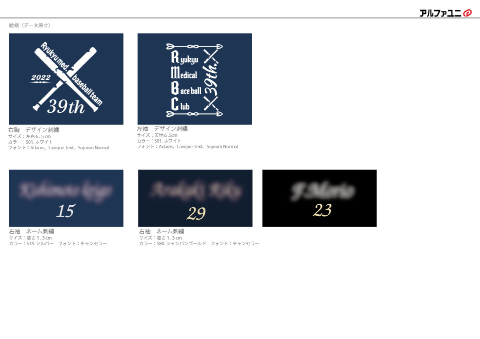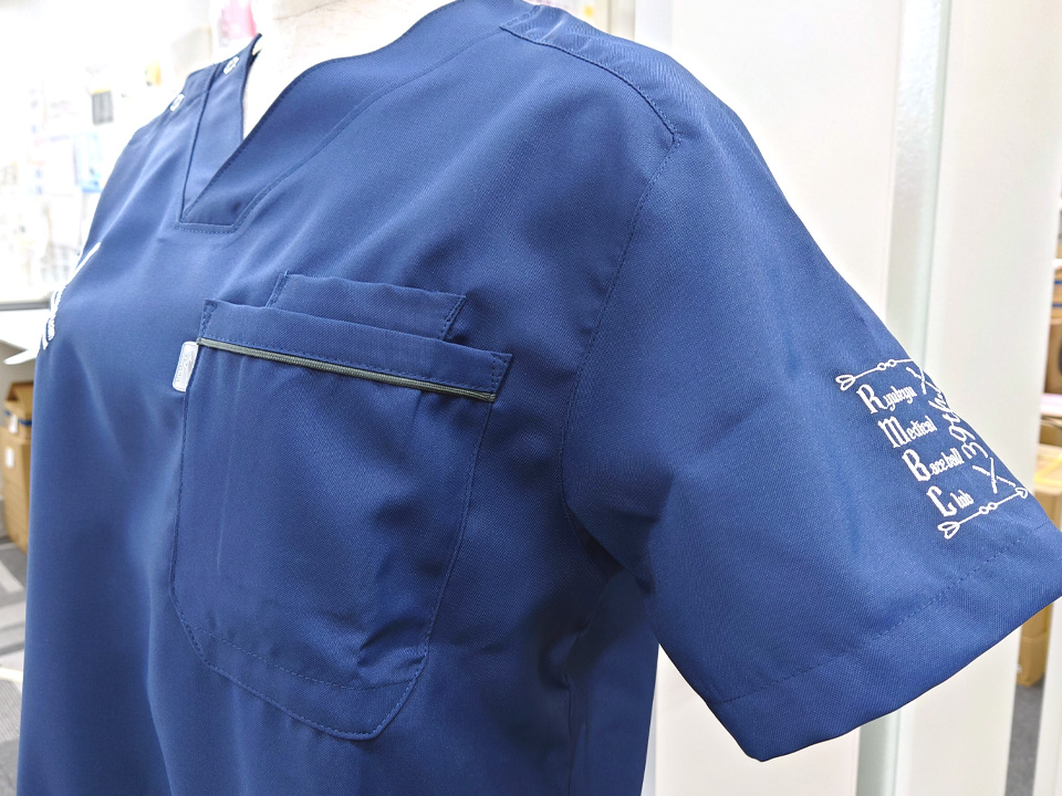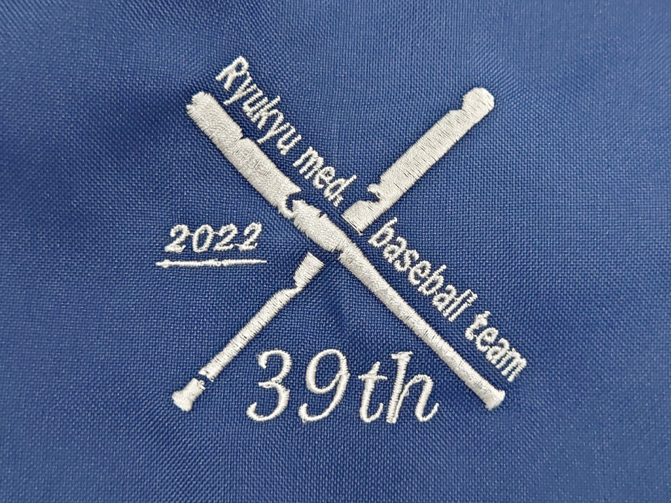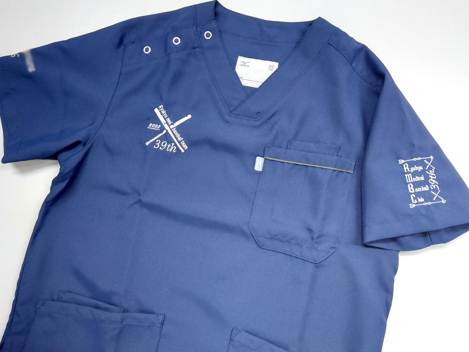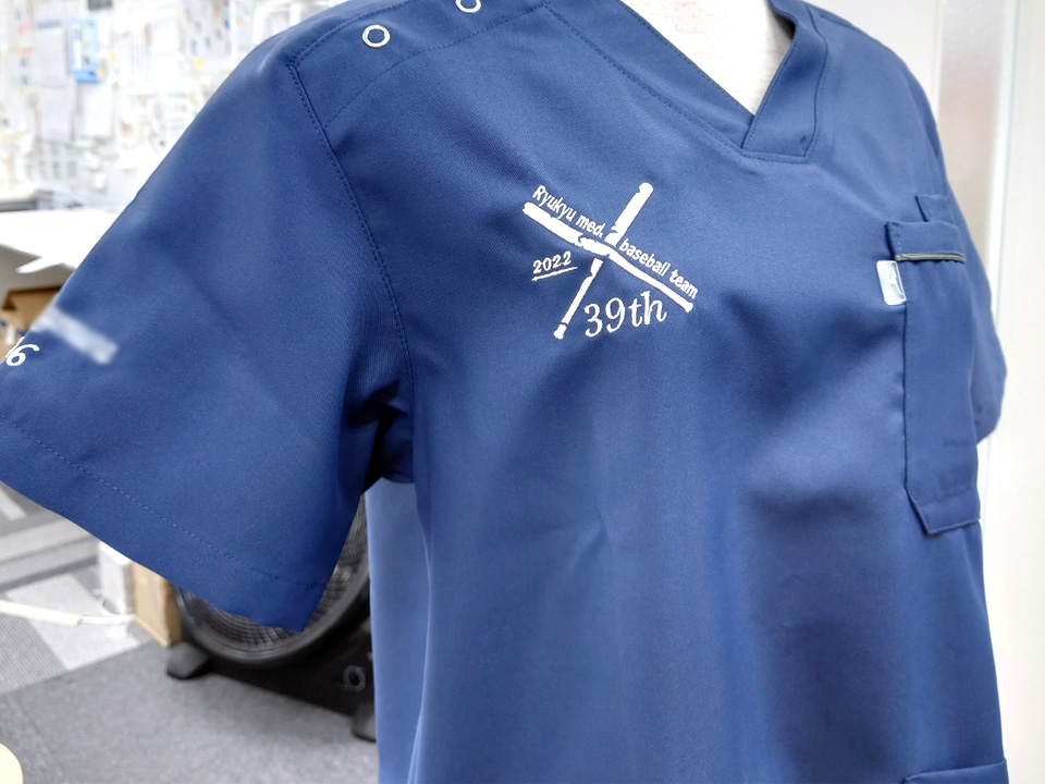 チームスクラブ 【NO.270】琉球大学医学部準硬式野球部2022様 MZ-0018 デザイン刺繍ネーム刺繍胸袖 【実績No.270】 琉球大学医学部準硬式野球部2022様-卒業記念チームスクラブのご紹介です。 このたびは製作のご依頼、および画像のご提供ありがとうございました。 想像いただいていた通りに刺繍で再現できたというコメントをいただき製作側としても大変嬉しく思っております。 お客様からのコメント 今回は、素敵なスクラブを作ってくださり、ありがとうございました。 バットの欠けたデザインを私達が想像していた通りに刺繍していただいて、大変嬉しいです。 ネーム刺繍も2段目に背番号を入れてもらえたので、野球部らしいスクラブに仕上がりました。 変更点のメールや配送日のメールなど、迅速で丁寧な対応ありがとうございました。 後輩にもおすすめしたいと思います。 また機会がありましたら、よろしくお願い致します。 からのコメント このたびはアルファユニをご利用いただきましてありがとうございました! ●マーキングの詳細説明 左袖と右胸にデザイン刺繍、右袖にネーム刺繍を入れさせていただきました。ネームの下には背番号も入れています。 この記事をシェア その他おすすめ事例 【No.3】嘉悦大学インキュベーション同好会様 1525PH(廃番) 【No.6】北野病院様 MZ-0092 【No.8】佐久総合病院様 7003SC 実績一覧 特集 アルファユニカタログVol.5 刺繍の見た目が変わる?生地の違いと刺繍の差 コックコート・飲食系ユニフォーム特集 全面昇華プリントスクラブ 特集一覧