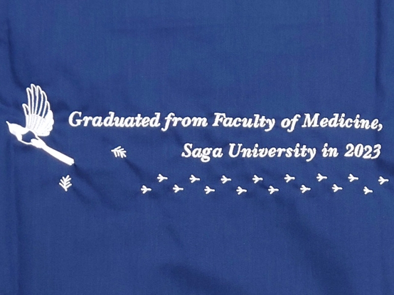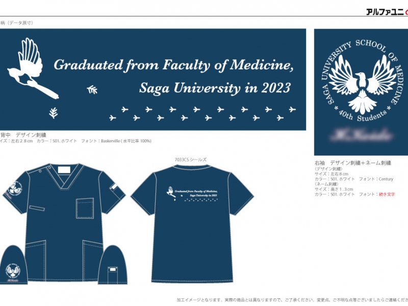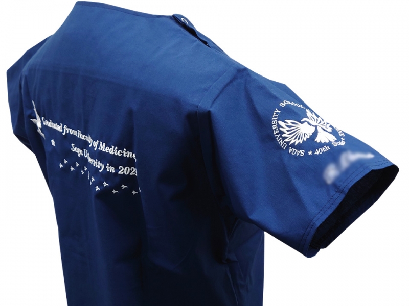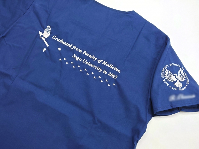 卒業記念 【NO.281】佐賀大学医学部2023年卒業生様 7033SC デザイン刺繍ネーム刺繍背中袖 【実績No.281】 佐賀大学医学部2023年卒業生様-卒業記念スクラブのご紹介です。 一昨年、昨年に続き3年連続で製作のご依頼をいただきました。 ご注文および着用画像のご提供ありがとうございました。 お客様からのコメント 卒業記念に学年スクラブを作成していただきありがとうございました。 スクラブを受けとった方から大変好評な仕上がりでした。 国試終了後からで急な注文になりましたが、丁寧なご対応をしていただきありがとうございました。 からのコメント このたびはアルファユニをご利用いただきましてありがとうございました! ●マーキングの詳細説明 右袖にデザイン刺繍とネーム刺繍、背中に大学名と佐賀県の県の鳥であるカササギのデザイン刺繍を入れさせていただきました。 この記事をシェア その他おすすめ事例 【No.2】福島県立医科大学様 Z1004 【No.4】大学医学部医学科LaRa 8th卒業生様 DS-2001 【No.5】東京医科大学2015年卒業生様 7000SC 実績一覧 特集 アルファユニカタログVol.5 刺繍の見た目が変わる?生地の違いと刺繍の差 コックコート・飲食系ユニフォーム特集 全面昇華プリントスクラブ 特集一覧