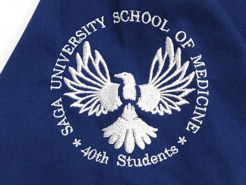 右袖にデザイン刺繍とネーム刺繍、背中に大学名と佐賀県の県の鳥であるカササギのデザイン刺繍を入れさせていただきました。