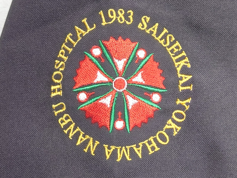 左袖に同病院のロゴマークのデザイン刺繍、背中に病院名とラインのフォント刺繍を入れさせていただきました。