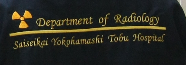 背中に左右27㎝でデザイン刺繍を入れました。放射線マークを左上に入れ、上段に科名、下段に病院名を配置したデザインです。