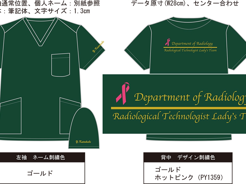 チームスクラブ 【No.77】済生会横浜市東部病院放射線科様 7000SC デザイン刺繍ネーム刺繍背中袖 【実績No.77】 済生会横浜市東部病院放射線科様オリジナル・スクラブのご紹介です。スクラブ着用写真のご提供ありがとうございました! からのコメント このたびはアルファユニをご利用いただきましてありがとうございました! 2012年最初に製作依頼をいただいてから継続的に追加製作をさせていただいております。刺繍型は半永久的に無料で使用できますので、引き続き宜しくお願い致します。 ●マーキングの詳細説明 背中に左右27㎝でデザイン刺繍を入れました。放射線マークを左上に入れ、上段に科名、下段に病院名を配置したデザインです。 背中にマークを入れる場合は、プリントで一般的ですが、メディカル系のスクラブ・白衣については、刺繍を入れることが近年多くなっております。当初は若干重たい感じから着心地に影響するかと思っておりましたが、実績には年々増加傾向となっております。洗濯耐久性の問題だけでなく、立体感や存在感という点で刺繍代は高くなってもメリットを感じてもらえるからだと解釈しております。画像をご覧いただければかなり高密度盛り上がっております。 2017年には放射線マークをピンクリボンに変更したニューバージョンで製作をさせていただきましたので、加工イメージを参考にアップ致します。 この記事をシェア その他おすすめ事例 【No.3】嘉悦大学インキュベーション同好会様 1525PH(廃番) 【No.6】北野病院様 MZ-0092 【No.8】佐久総合病院様 7003SC 実績一覧 特集 アルファユニカタログVol.5 刺繍の見た目が変わる?生地の違いと刺繍の差 コックコート・飲食系ユニフォーム特集 全面昇華プリントスクラブ 特集一覧