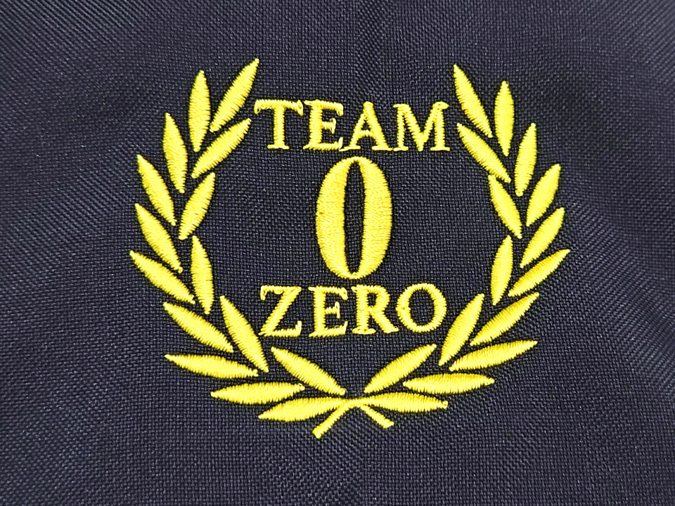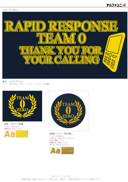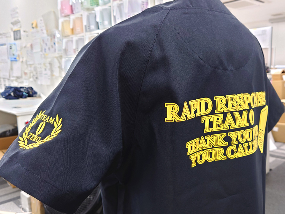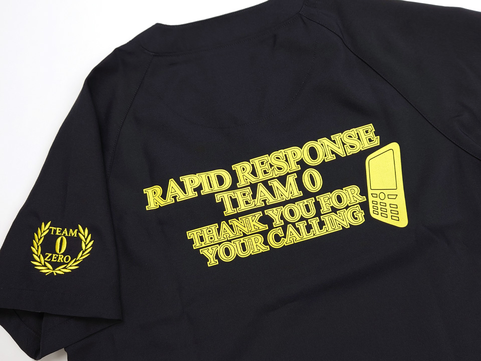 左袖にチーム名と月桂樹を組み合わせたオリジナルのデザイン刺繍、背中には救急を思わせるデザインを1色シルクプリントで入れさせていただきました。また、左袖に入れたものと同じデザインの刺繍ワッペン製作もしました。