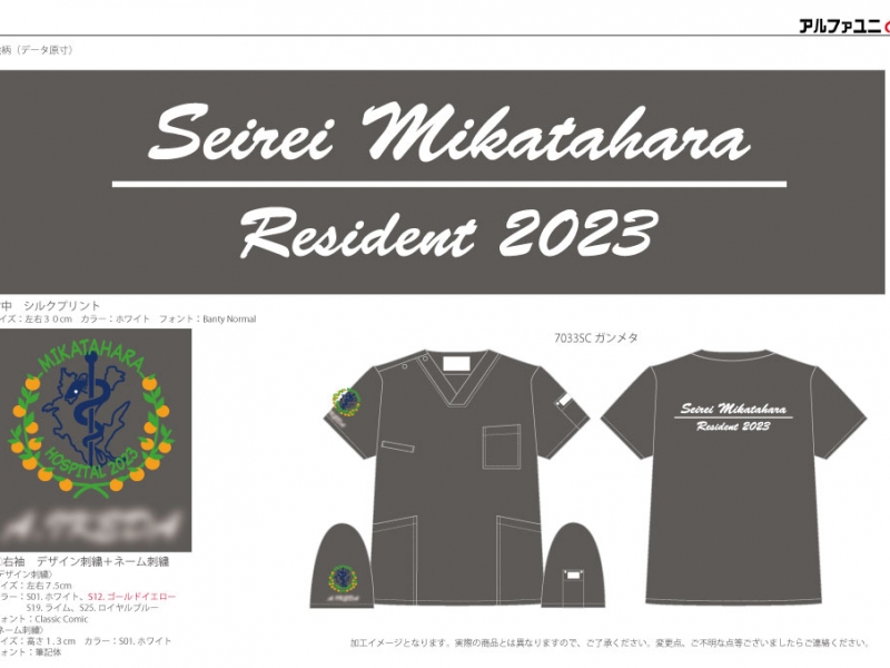研修医 【NO.293】聖隷三方原病院2023年研修医様 7033SC シルクプリントデザイン刺繍ネーム刺繍背中袖 【実績No.293】 聖隷三方原病院2023年研修医様-オリジナルチームスクラブのご紹介です。 背中はシルクプリント共通、デザイン刺繍は別柄で2パターン製作をさせていただきました。 ご当地の名産品をイラストとして組み入れたデザインで、 1パターンはシンプルに1色でもう1パターンは4色使いでカラフルな仕上がりです! このたびは製作のご依頼、および画像のご提供ありがとうございました。 お客様からのコメント 刺繍の色を調整していただき、希望通りのかわいいデザインになりました。 細かいデザインでしたが、針数を減らす提案をしていただき、値段を抑えつつも希望通り仕上がりにしていただき、嬉しかったです。 ありがとうございます! からのコメント このたびはアルファユニをご利用いただきましてありがとうございました! ●マーキングの詳細説明 右袖にデザイン刺繍とネーム刺繍、背中に病院名のシルクプリントを入れさせていただきました。デザインは2種類作成。1つは浜松市の名産であるミカンにアスクレピオスの杖と浜名湖の形をかたどったデザインを組み合わせたもの。もう1つはこちらも浜松市の名産であるウナギと世界的なシェアを誇るピアノ、浜松城を組み合わせたものとなっています。 この記事をシェア その他おすすめ事例 【No.17】焼津市立病院様 7003SC 【No.24】長岡赤十字病院研修医様 MZ-0092 【No.50】宮古島徳洲会病院様 7003SC 実績一覧 特集 アルファユニカタログVol.5 刺繍の見た目が変わる?生地の違いと刺繍の差 コックコート・飲食系ユニフォーム特集 全面昇華プリントスクラブ 特集一覧