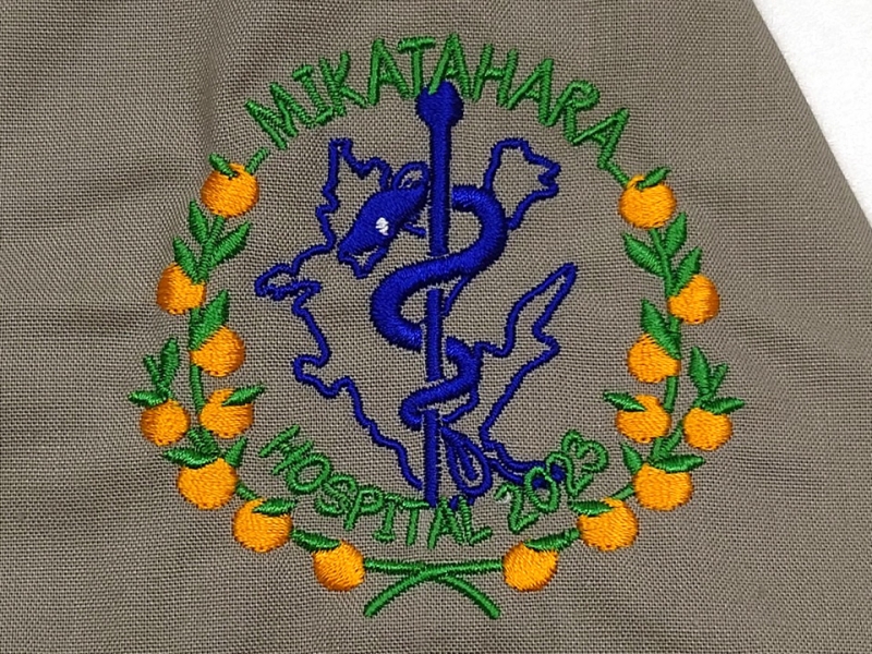 右袖にデザイン刺繍とネーム刺繍、背中に病院名のシルクプリントを入れさせていただきました。デザインは2種類作成。1つは浜松市の名産であるミカンにアスクレピオスの杖と浜名湖の形をかたどったデザインを組み合わせたもの。もう1つはこちらも浜松市の名産であるウナギと世界的なシェアを誇るピアノ、浜松城を組み合わせたものとなっています。