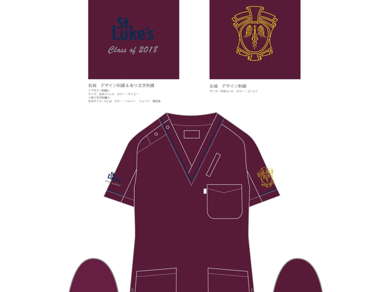 左袖は聖路加国際病院のエンブレムを1色で、右袖には聖路加国際病院のロゴを同じく1色で、それぞれデザイン刺繍で入れました。