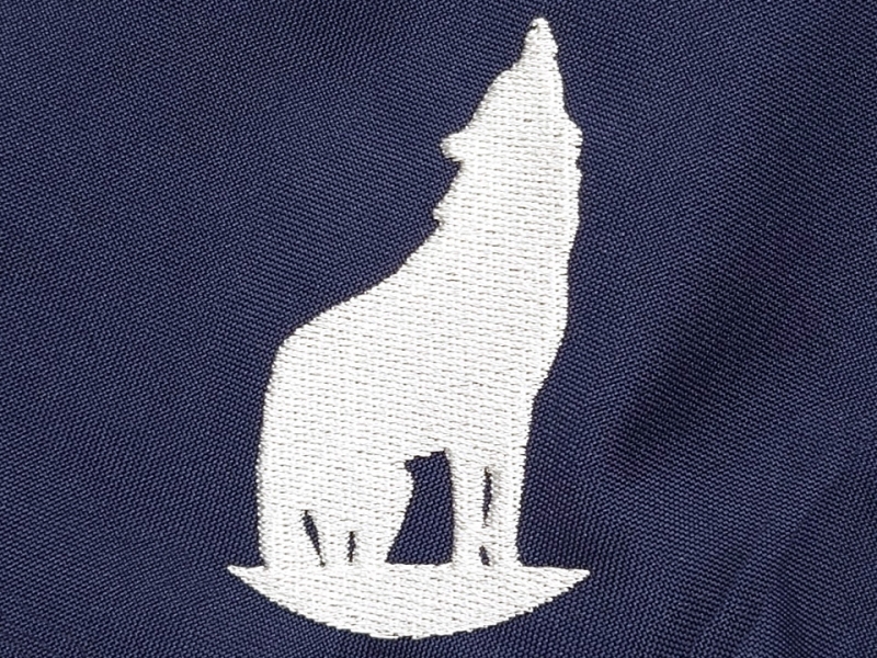 左袖に狼のデザイン刺繍とネーム刺繍、背中にチーム名とラインのフォント刺繍を入れさせていただきました。