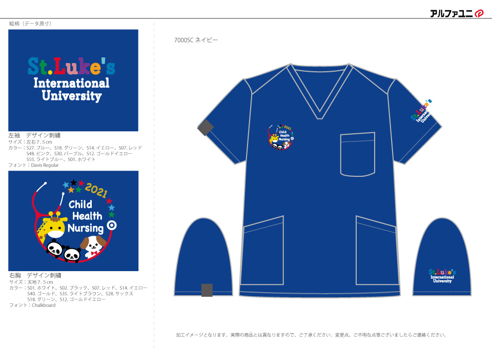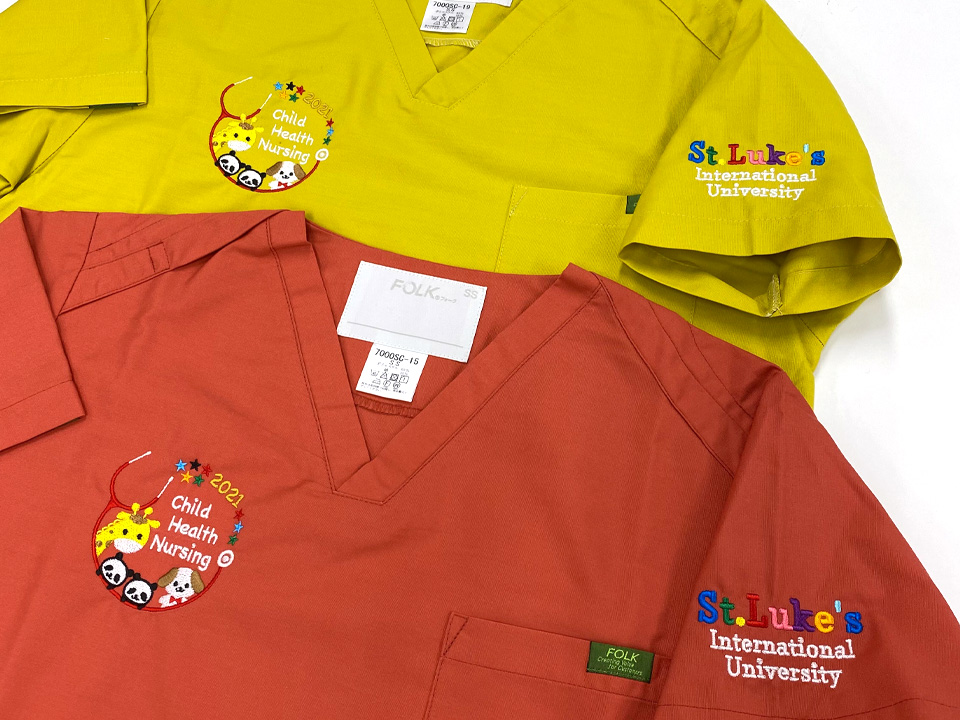 チームスクラブ 【NO.235】聖路加国際大学大学院様 7000SC デザイン刺繍胸袖 【実績No.209】 聖路加国際大学大学院様-デザインスクラブのご紹介です。 このたびは製作のご依頼、および画像のご提供ありがとうございました。 お客様からのコメント 2021年のイベントをデザインにして、 コロナに負けない思い出に残るスクラブになりました。 からのコメント このたびはアルファユニをご利用いただきましてありがとうございました! ● マーキングの詳細説明 左袖に学校名をデザイン刺繍、右胸には動物の可愛らしいイラストと文字をデザイン刺繍させていただきました。 FOLK7000SC PANTONEスクラブの生地は生地の密度が低いた目、細かい柄の刺繍には向きません。 しかしながら、刺繍のそのもの糸密度をかなり上げたので、細かい部分再現も想定よりも綺麗に仕上がりました。 この記事をシェア その他おすすめ事例 【No.3】嘉悦大学インキュベーション同好会様 1525PH(廃番) 【No.6】北野病院様 MZ-0092 【No.8】佐久総合病院様 7003SC 実績一覧 特集 アルファユニカタログVol.5 刺繍の見た目が変わる?生地の違いと刺繍の差 コックコート・飲食系ユニフォーム特集 全面昇華プリントスクラブ 特集一覧