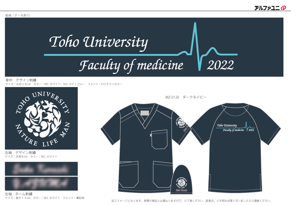 卒業記念 【NO.237】東邦大学医学部2022年卒業生様 MZ-0120 デザイン刺繍ネーム刺繍背中袖 【実績No.237】 東邦大学医学部2022年卒業生様-デザインスクラブのご紹介です。 東邦大学医学部様からは毎年卒業記念スクラブの製作のご依頼いただいております。 製作のご依頼および画像のご提供ありがとうございました。 お客様からのコメント 全てのデザインを刺繍にした事で、シンプルでかっこいいスクラブになりました。他の学生からもデザインは好評でした! また、スクラブの素材も扱いやすそうで満足です。 デザイン決定から配送まで色々とこちらの要望に対応して頂き、ありがとうございました。 また来年度も後輩がお世話になるかと思いますが、よろしくお願いいたします。 からのコメント このたびはアルファユニをご利用いただきましてありがとうございました! ●マーキングの詳細説明 左袖にデザイン刺繍とネーム刺繍、背中にデザイン刺繍を入れさせていただきました。 この記事をシェア その他おすすめ事例 【No.2】福島県立医科大学様 Z1004 【No.4】大学医学部医学科LaRa 8th卒業生様 DS-2001 【No.5】東京医科大学2015年卒業生様 7000SC 実績一覧 特集 アルファユニカタログVol.5 刺繍の見た目が変わる?生地の違いと刺繍の差 コックコート・飲食系ユニフォーム特集 全面昇華プリントスクラブ 特集一覧