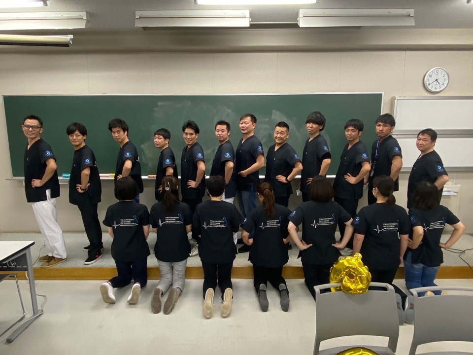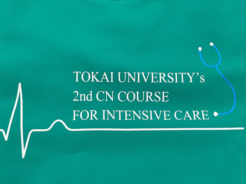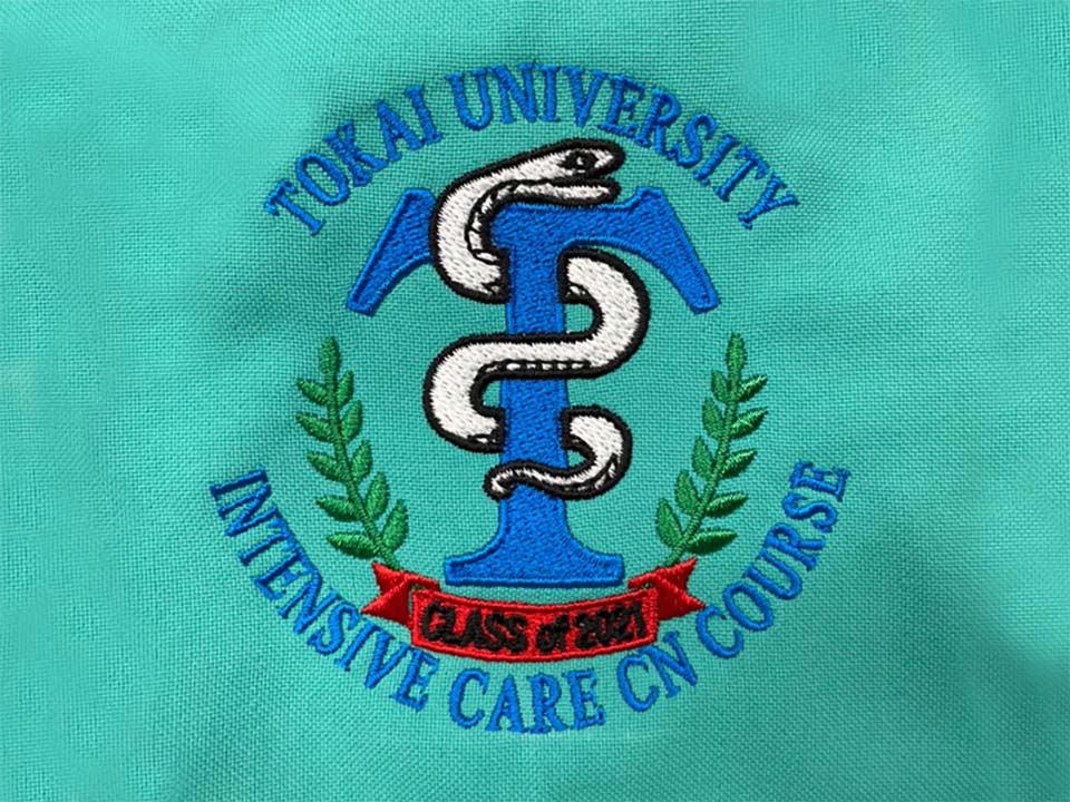 左袖に大学のイニシャルであるTとヘビを組み合わせたオリジナルデザインの刺繍をしました。背中にシルクプリント(2色)で心電図と聴診器のデザイン、学科名を入れさせていただきました。