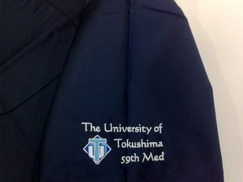 左袖にデザイン刺繍を入れました。刺繍デザインについては徳島大学のマークを大学名をバランスよく配置するために、いくつかの配置パターンを3つご提案させていただき、マークを左下に配置する形でになりました。