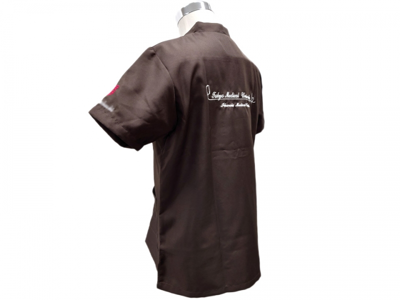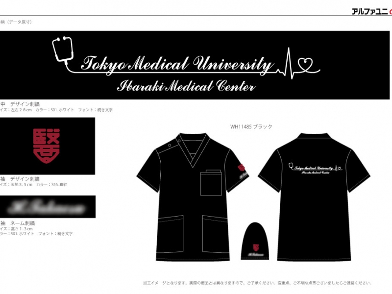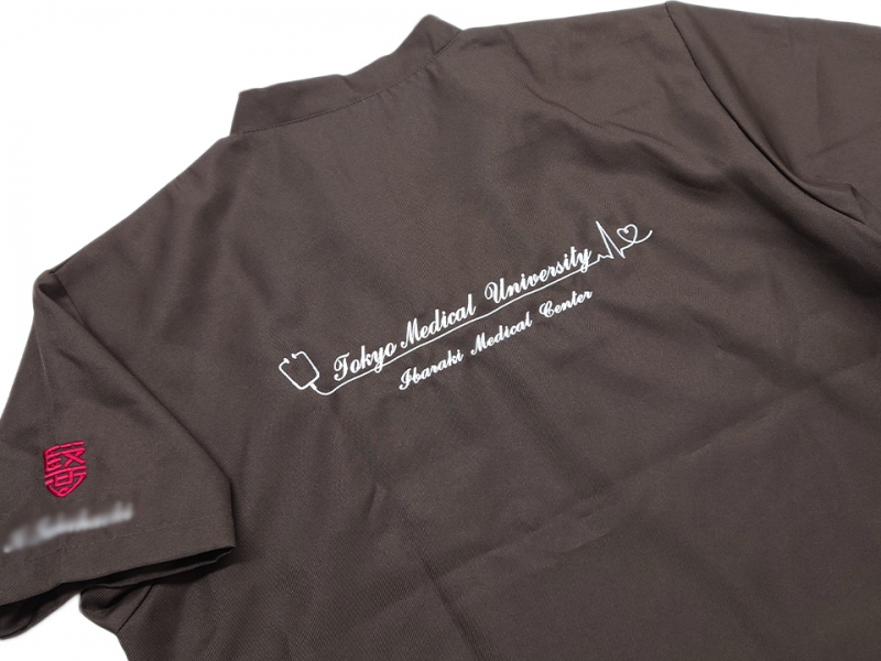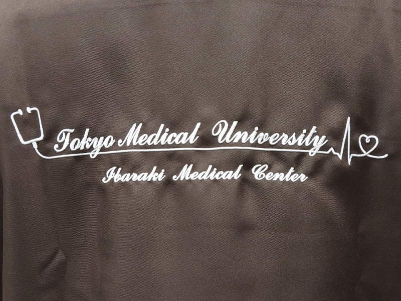 左袖に東京医科大学の校章のデザイン刺繍とネーム刺繍、背中に同センター名と聴診器や心電図を組み合わせたデザイン刺繍を入れさせていただきました。