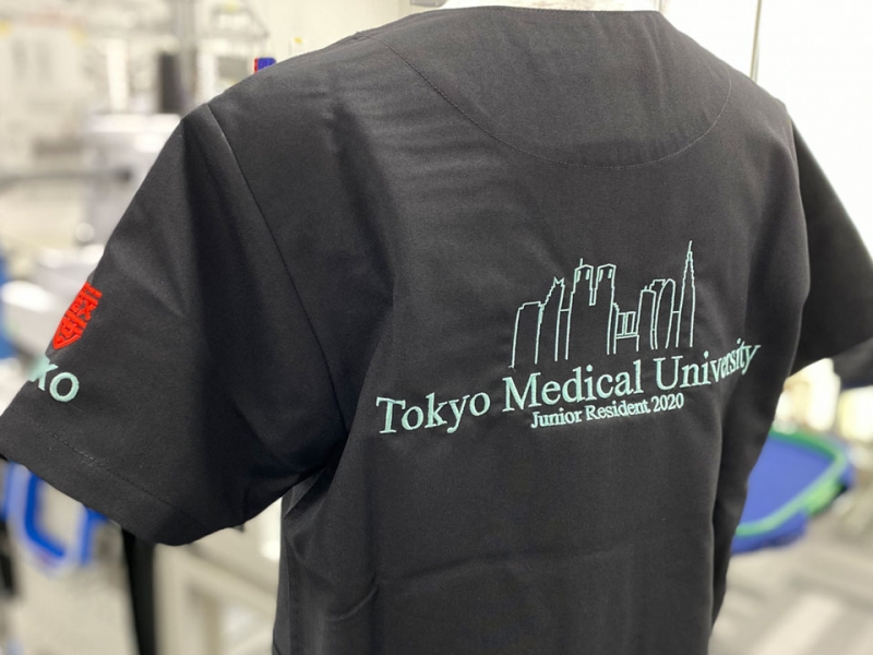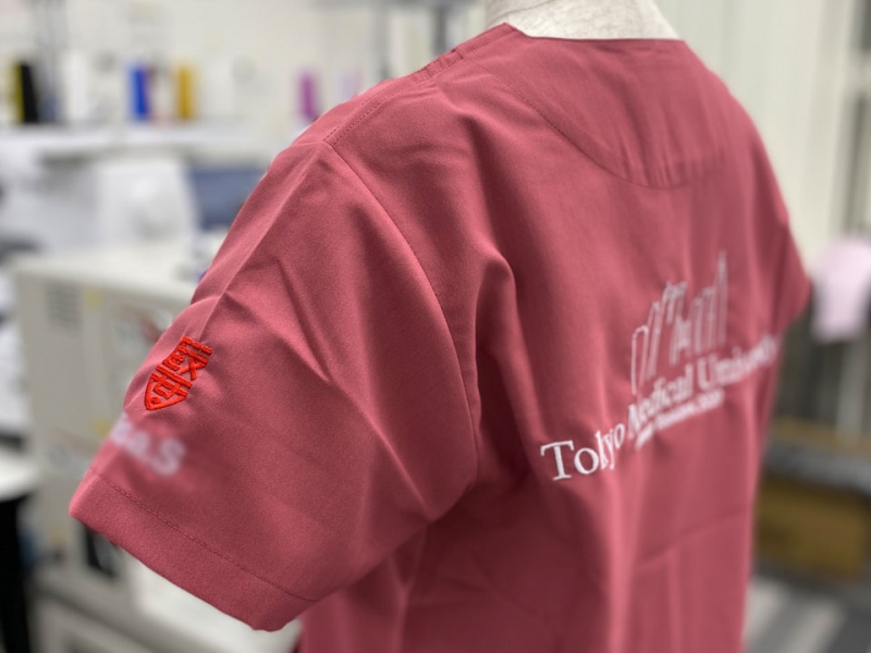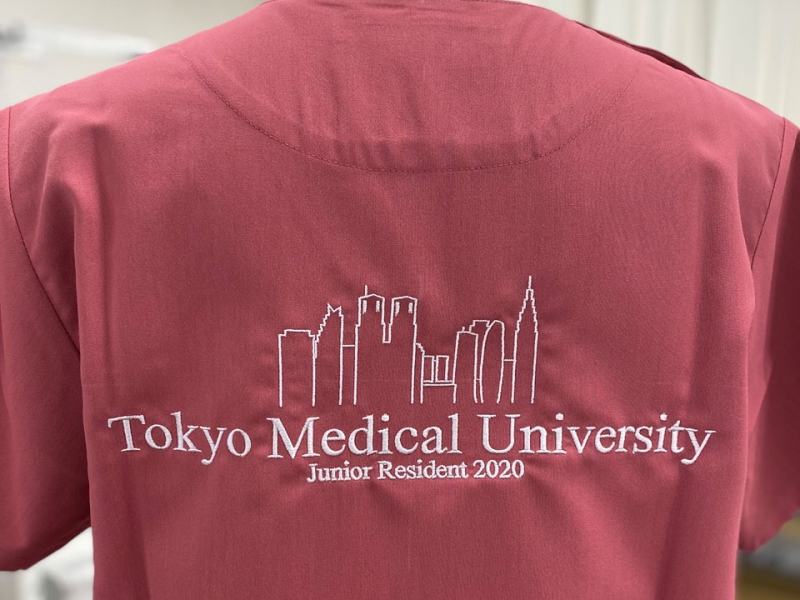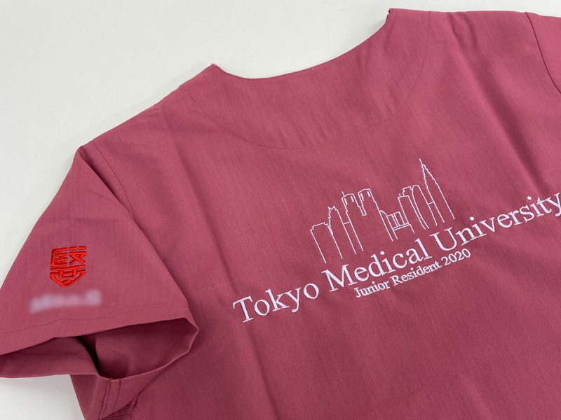 背中デザイン刺繍、左袖にデザイン刺繍とネーム刺繍を入れさせていただきました。袖の東京医科大学様の校章は刺繍型がありますので、型代無料で刺繍が可能です。