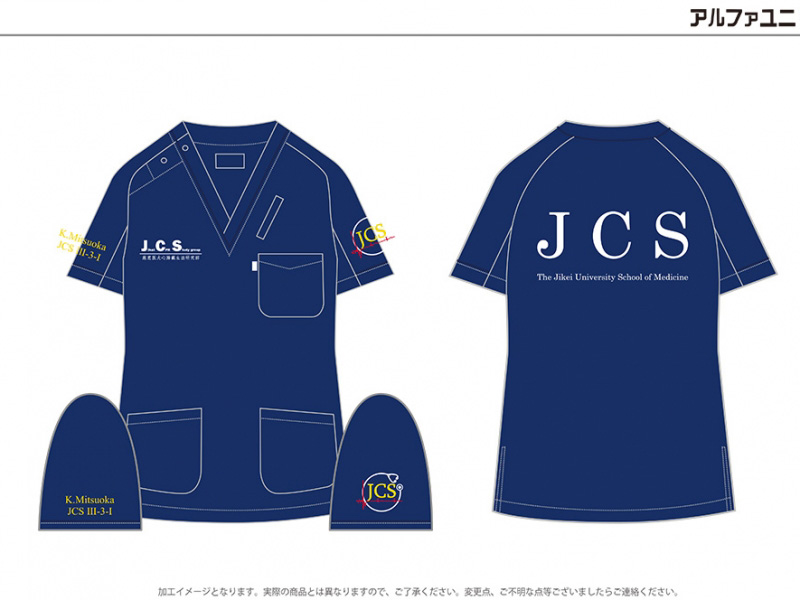 チームスクラブ 【No.75】東京慈恵会医科大学 Jikei CPR Study group MZ-0092 シルクプリントデザイン刺繍ネーム刺繍プリント 1色フォント刺繍背中胸袖 【実績No.75】 東京慈恵会医科大学 Jikei CPR Study group様のオリジナルスクラブのご紹介です。 画像のご提供ありがとうございました。 お客様からのコメント スクラブの作製にあたり、ロゴのデザインや文字の大きさなど、こちらの要望に対してとても親身に対応してくださいました。 着心地も良く、その出来栄えには非常に満足しております。 素敵なスクラブをありがとうございました。 からのコメント このたびはアルファユニをご利用いただきましてありがとうございました! ●マーキングの詳細説明 各1色シルクプリント、左袖デザイン刺繍 右袖 有り文字刺繍+ネーム刺繍をさせていただきました。 この記事をシェア その他おすすめ事例 【No.3】嘉悦大学インキュベーション同好会様 1525PH(廃番) 【No.6】北野病院様 MZ-0092 【No.8】佐久総合病院様 7003SC 実績一覧 特集 アルファユニカタログVol.5 刺繍の見た目が変わる?生地の違いと刺繍の差 コックコート・飲食系ユニフォーム特集 全面昇華プリントスクラブ 特集一覧
