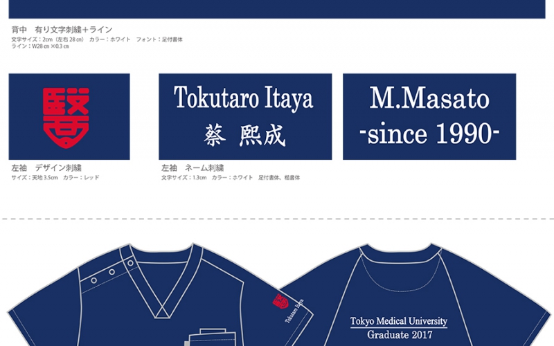 卒業記念 【No.72】東京医科大学様2017 MZ-0018 デザイン刺繍ネーム刺繍フォント刺繍背中袖 【実績No.72】 東京医科大学2017年卒業生様オリジナルスクラブ製作実績の紹介です。 画像をお送りいただき、ありがとうございます。 お客様からのコメント お世話になっております。 スクラブ、イメージ通りでとても気に入りました。みんなも喜んで着ていました! 写真ですが、全員で集まれる機会がなかったので何人かで撮った写真しかないのですが一応添付します。 からのコメント このたびはアルファユニをご利用いただきましてありがとうございました!皆様に喜んでいただけたようで、大変うれしく思います。スタッフ一同、この喜びを励みに、お客様により良い商品をお届けできるよう、頑張ってまいります。 ●マーキングの詳細説明 校章のデザイン刺繍は刺繍型があるので、刺繍型代無料にて刺繍させていただきました。刺繍サイズは天地3.5㎝となります。 この記事をシェア その他おすすめ事例 【No.2】福島県立医科大学様 Z1004 【No.4】大学医学部医学科LaRa 8th卒業生様 DS-2001 【No.5】東京医科大学2015年卒業生様 7000SC 実績一覧 特集 アルファユニカタログVol.5 刺繍の見た目が変わる?生地の違いと刺繍の差 コックコート・飲食系ユニフォーム特集 全面昇華プリントスクラブ 特集一覧