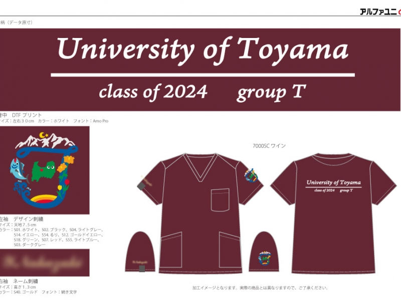 チームスクラブ 【NO.300】富山大学2024年グループT様 DTFプリントデザイン刺繍ネーム刺繍背中袖 【実績No.300】 富山大学2024年グループT様-オリジナルチームスクラブのご紹介です。 袖の刺繍は全10色の糸を使用し、デザイン自体もかなり細かい表現がある大変凝ったものですが、刺繍の仕上がりにご満足いただけたようです。 このたびは製作のご依頼、および画像のご提供ありがとうございました。 お客様からのコメント 初めての利用でしたが、刺繍も可愛く仕上げていただき、感動しました。 実習班の思い出のスクラブを作ることができました。 ありがとうございました。 からのコメント このたびはアルファユニをご利用いただきましてありがとうございました! ●マーキングの詳細説明 左袖に富山を思わせるものを詰め込んだデザイン刺繍、右袖にネーム刺繍、背中にチーム名をDTFプリントで入れさせていただきました。 この記事をシェア その他おすすめ事例 【No.3】嘉悦大学インキュベーション同好会様 1525PH(廃番) 【No.6】北野病院様 MZ-0092 【No.8】佐久総合病院様 7003SC 実績一覧 特集 アルファユニカタログVol.5 刺繍の見た目が変わる?生地の違いと刺繍の差 コックコート・飲食系ユニフォーム特集 全面昇華プリントスクラブ 特集一覧