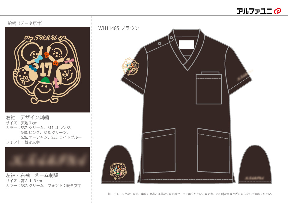 チームスクラブ 【NO.232】東京女子医科大学小児医療研究会様 WH11485 デザイン刺繍ネーム刺繍袖 【実績No.232】 東京女子医科大学小児医療研究会様-デザインスクラブのご紹介です。 このたびは製作のご依頼、および画像のご提供ありがとうございました。 お客様からのコメント この度は素敵なスクラブをありがとうございました!細かいデザインをお願いしてしまいましたが、とっても可愛く仕上げて下さり皆大感激しております。記念に残るスクラブとしてこれからも大切に着用させて頂きます。 からのコメント このたびはアルファユニをご利用いただきましてありがとうございました! ●マーキングの詳細説明 左袖にデザイン刺繍、右袖にネーム刺繍と学校名を有り文字刺繍で入れさせていただきました。 この記事をシェア その他おすすめ事例 【No.3】嘉悦大学インキュベーション同好会様 1525PH(廃番) 【No.6】北野病院様 MZ-0092 【No.8】佐久総合病院様 7003SC 実績一覧 特集 アルファユニカタログVol.5 刺繍の見た目が変わる?生地の違いと刺繍の差 コックコート・飲食系ユニフォーム特集 全面昇華プリントスクラブ 特集一覧