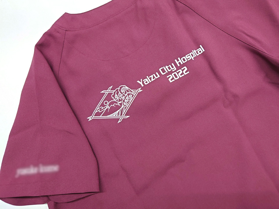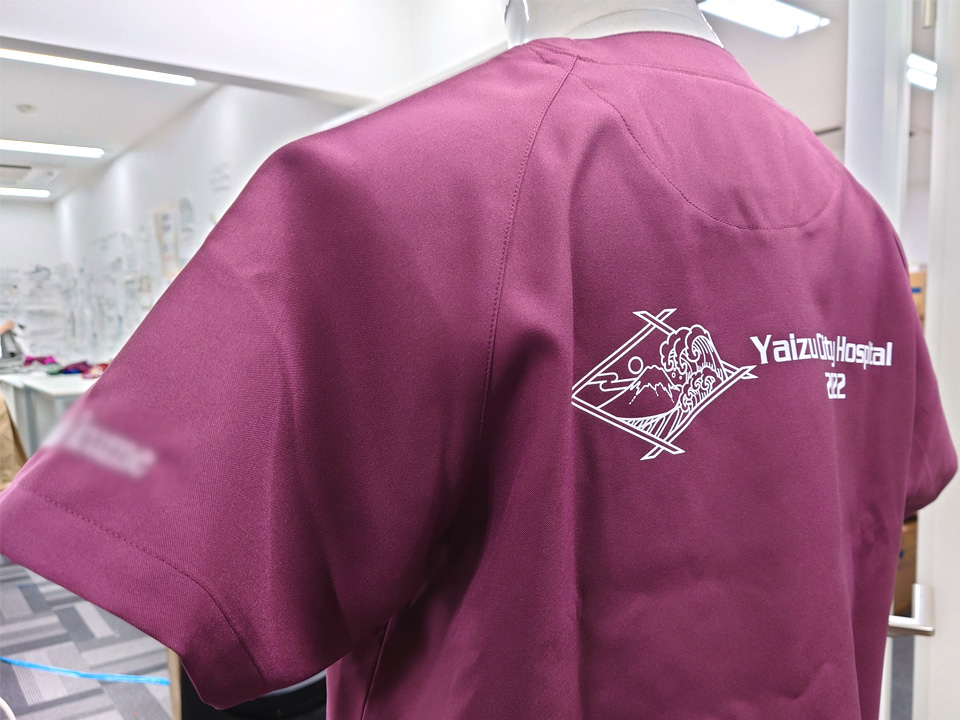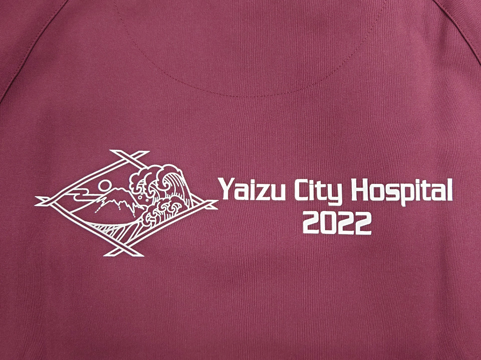 背中に富士山と波、病院名でデザインしたシルクプリントを入れました。左袖にはネーム刺繍を入れています。