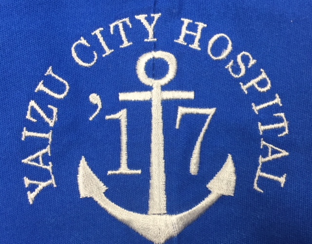 以前は焼津ということでマグロのデザインを刺繍したスクラブを製作しましたが、今回はカジキマグロと錨のイラストを入れたデザインとなりました。