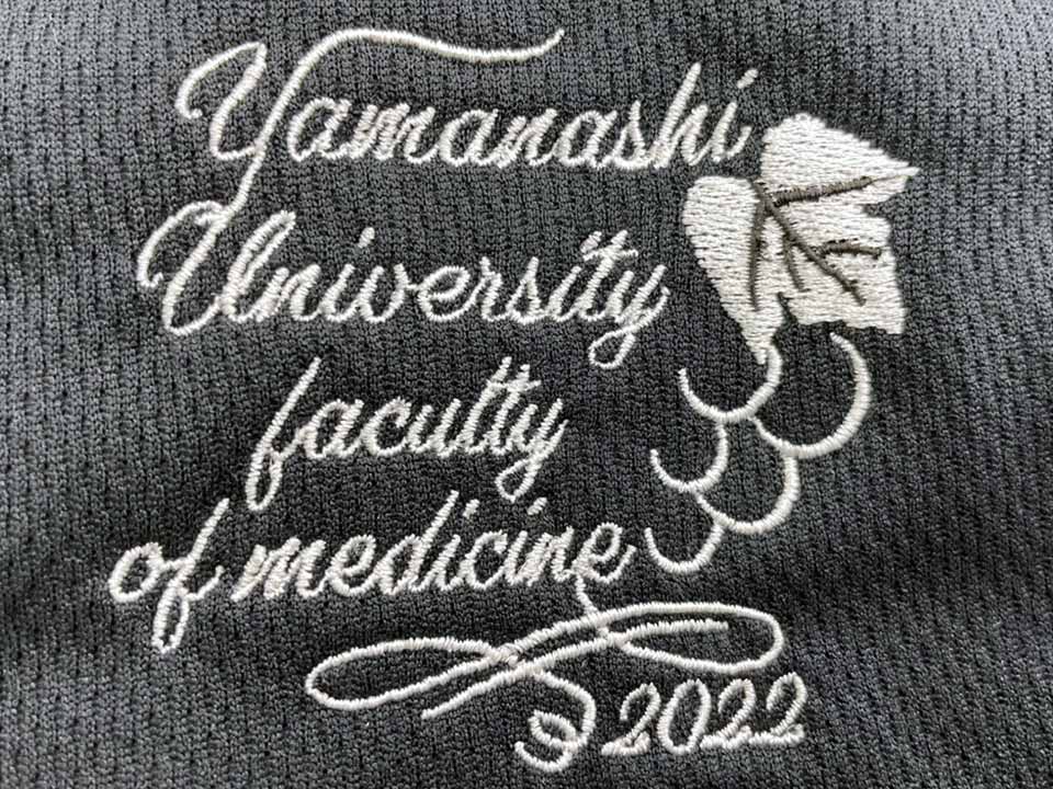 左袖に山梨名産のブドウと学部名のデザイン刺繍、右袖にネーム刺繍を入れさせていただきました。