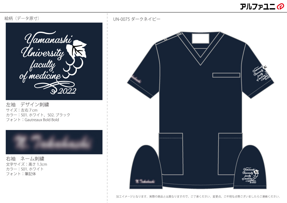 卒業記念 【NO.242】山梨大学医学部2022年卒業生様 UN-0074 デザイン刺繍ネーム刺繍袖 【実績No.242】 山梨大学医学部2022年卒業生様-デザインスクラブのご紹介です。オリジナルデザインを刺繍で入れました。 このたびは製作のご依頼、および画像のご提供ありがとうございました。 お客様からのコメント 商品の要望について細かくアドバイスをしていただき、自分達が求めるスクラブに近づくことができました。 また、スムーズに商品受け渡しまで滞りなく行うことができ、不安なくやりとりができました。 ありがとうございました。 からのコメント このたびはアルファユニをご利用いただきましてありがとうございました! ●マーキングの詳細説明 左袖に山梨名産のブドウと学部名のデザイン刺繍、右袖にネーム刺繍を入れさせていただきました。 この記事をシェア その他おすすめ事例 【No.2】福島県立医科大学様 Z1004 【No.4】大学医学部医学科LaRa 8th卒業生様 DS-2001 【No.5】東京医科大学2015年卒業生様 7000SC 実績一覧 特集 アルファユニカタログVol.5 刺繍の見た目が変わる?生地の違いと刺繍の差 コックコート・飲食系ユニフォーム特集 全面昇華プリントスクラブ 特集一覧