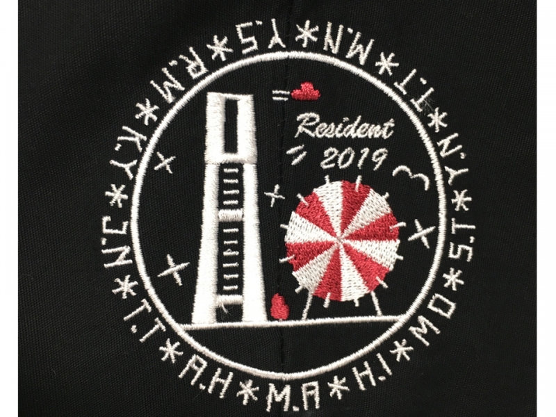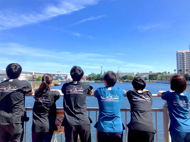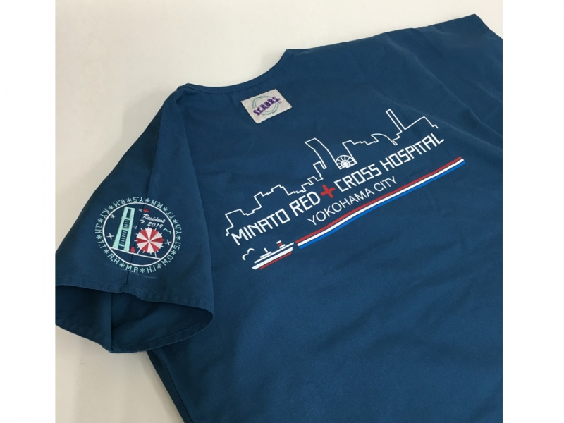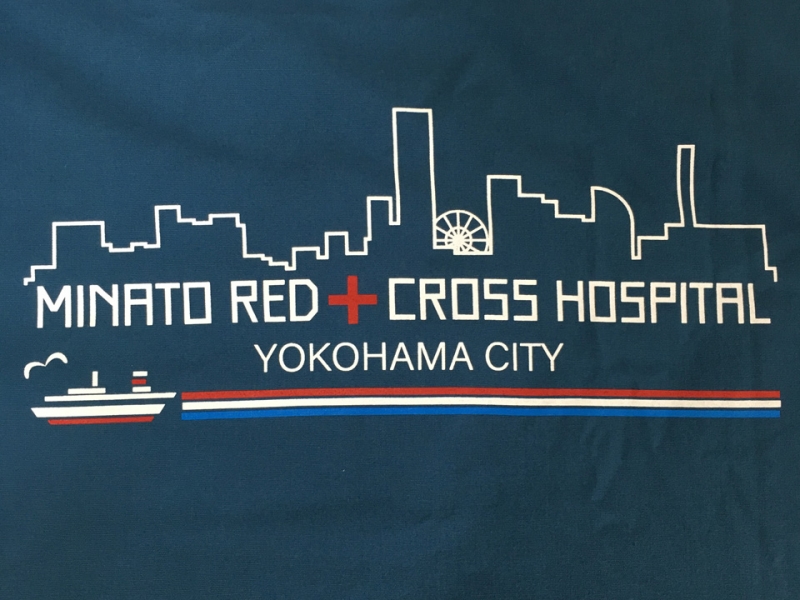 背中には病院名と横浜の夜景をイメージしたイラストをプリント、左袖にはみなとみらいをイメージしたオリジナルのマークを刺繍しました。