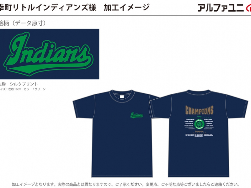 千葉市美浜区にある少年野球チーム幸町リトルインディアンズ様-優勝記念(チャンピオン)Tシャツ製作のご紹介です。