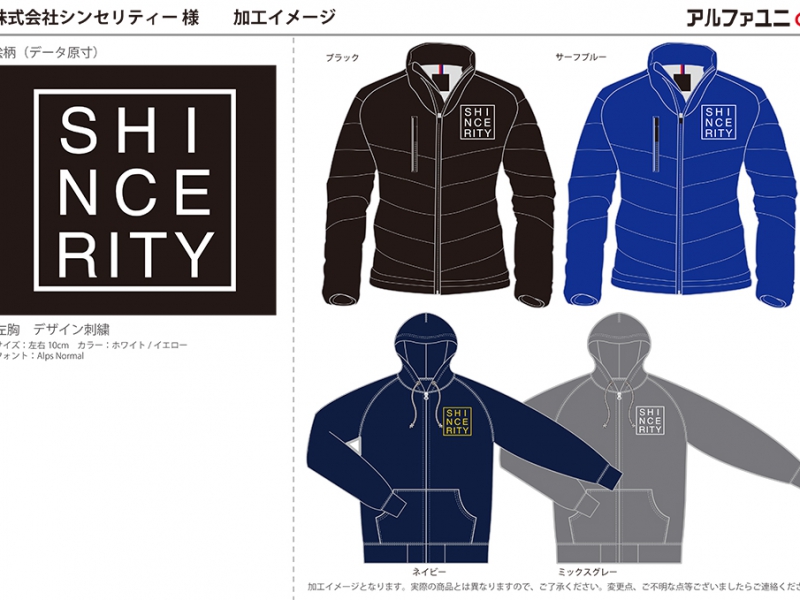 シンセリティー様オリジナルデザイン刺繍入り防寒ブルゾン・ジップアップパーカーのご紹介です。