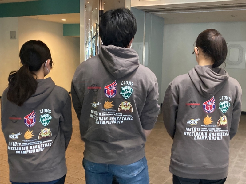 右胸に淑徳大学のロゴマークをシルクプリント、背中に大会に出場した各チームのロゴマークをDTFプリント、右袖に車いすバスケットボールをイメージしたデザイン刺繍を、それぞれ入れさせていただきました。