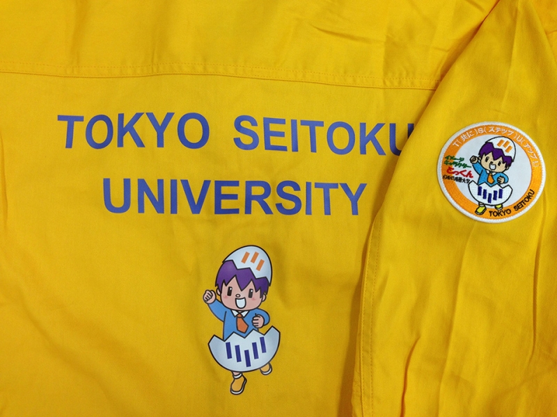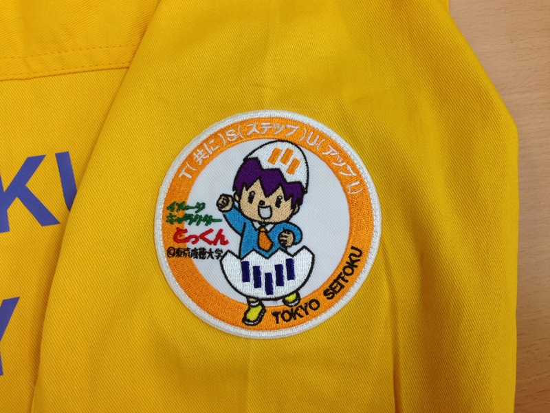 背中には、大学名と東京成徳大学の公式キャラクター「とっくん」をフルカラーでプリントし、袖には「とっくん」刺繍ワッペンを付けました。刺繍糸はなんと9色使いました。